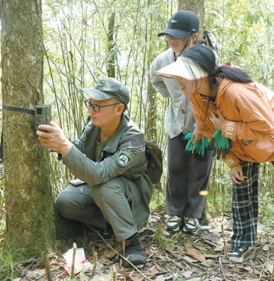 四川大相嶺大熊貓野化放歸研究基地巡護員在安裝調(diào)試紅外線相機。楊愛玲攝