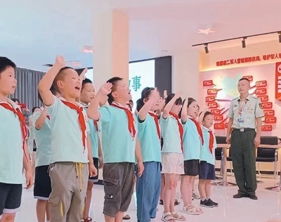 四川鹽亭縣文同小學(xué)學(xué)生在縣退役軍人之家活動(dòng)中心學(xué)習(xí)英模事跡,獻(xiàn)唱少先隊(duì)隊(duì)歌。李 勤攝(人民視覺(jué))