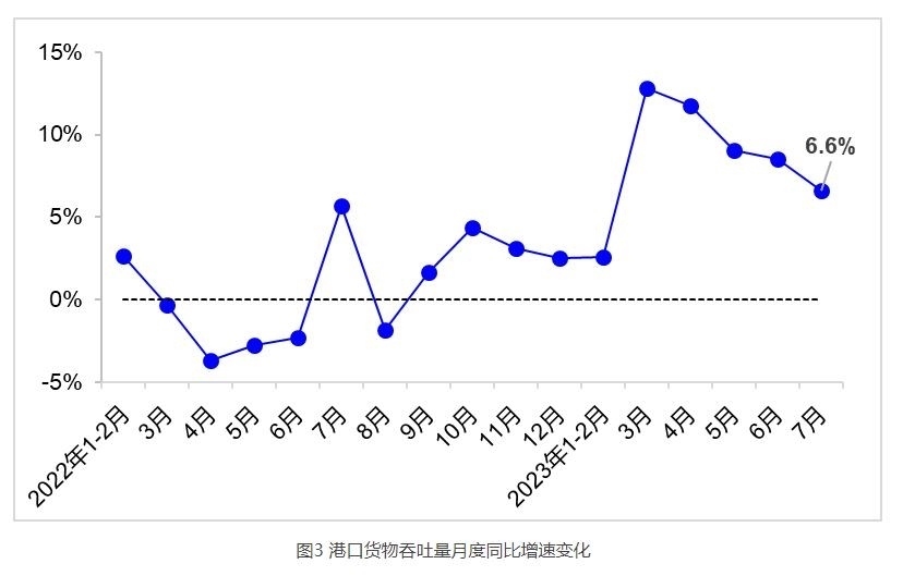 7月,全國港口完成貨物吞吐量14.3億噸,同比增長6.6%,其中內(nèi)、外貿(mào)吞吐量分別增長5.8%和8.5%。完成集裝箱吞吐量2705萬標箱,同比增長2.6%。