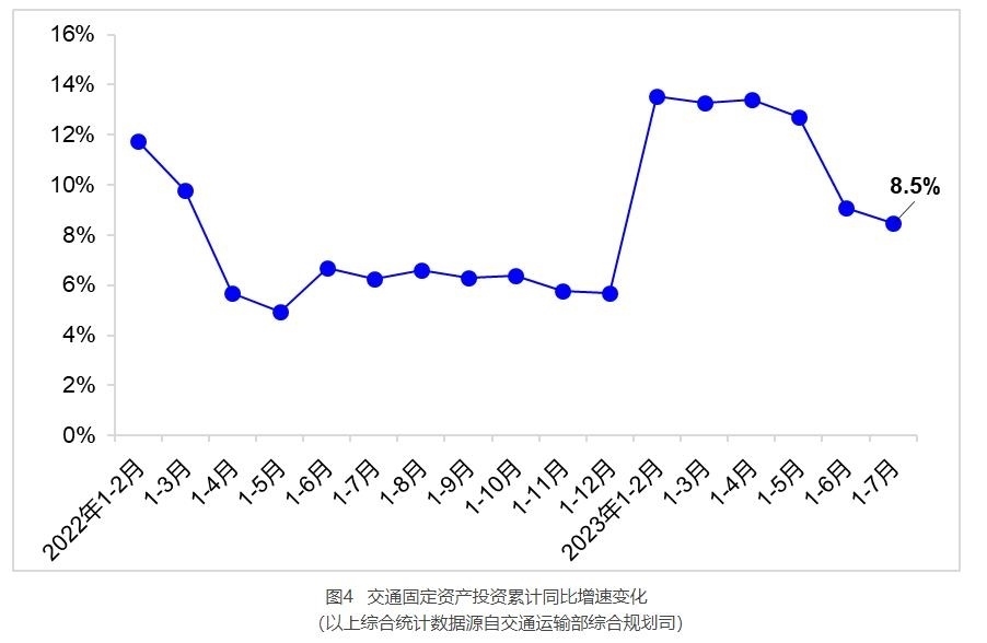 7月,完成交通固定資產(chǎn)投資3486億元,同比增長5.3%。其中,完成公路投資2548億元,同比增長3.9%;完成水運投資168億元,同比增長20.8%。