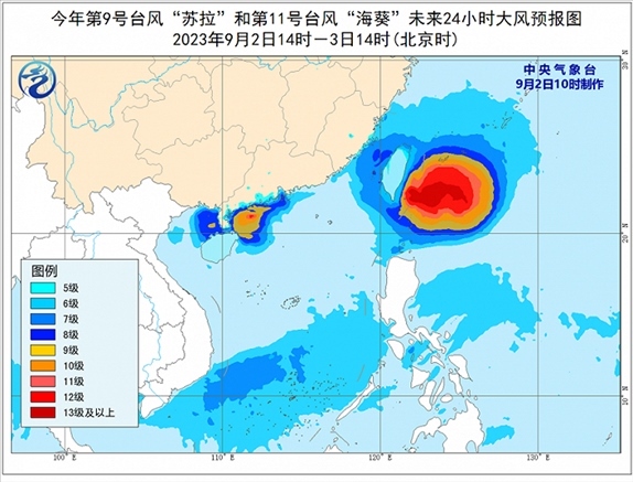 大風(fēng)預(yù)報(bào):9月2日14時(shí)至3日14時(shí),受“蘇拉”影響,南海西北部、北部灣東部、瓊州海峽及廣東中西部沿海、廣西南部沿海、海南北部沿海、珠江口以及香港和澳門(mén)等地將有6-8級(jí)、陣風(fēng)9-10級(jí)的大風(fēng),“蘇拉”中心經(jīng)過(guò)的附近海面或地區(qū)風(fēng)力有11-12級(jí)、陣風(fēng)13-14級(jí);受“海葵”影響,臺(tái)灣海峽、巴士海峽、浙江南部沿海、福建沿海、廣東東部沿海、臺(tái)灣島沿海將有6-8級(jí),陣風(fēng)9-10級(jí)大風(fēng),臺(tái)灣以東洋面部分海域風(fēng)力可達(dá)9-12級(jí),陣風(fēng)13-14級(jí),“??敝行慕?jīng)過(guò)的附近海面風(fēng)力可達(dá)13-16級(jí),陣風(fēng)17級(jí)及以上。