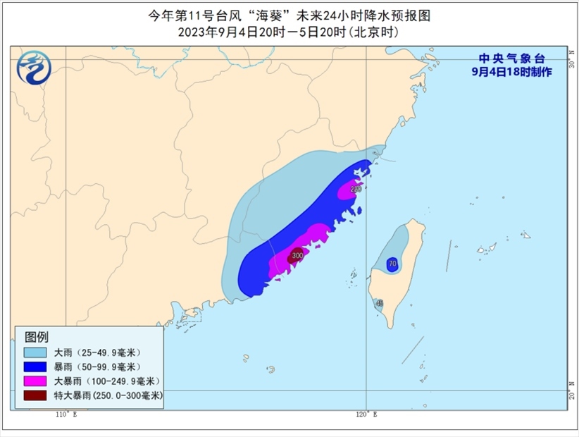 降水預(yù)報:9月4日20時至5日20時,福建大部、廣東東部、江西東南部、浙江東南部、臺灣島西部等地部分地區(qū)有大到暴雨,其中,福建東部、廣東東南部等地部分地區(qū)有大暴雨,局地特大暴雨(250-300毫米)。上述部分地區(qū)伴有短時強(qiáng)降水(最大小時降雨量30-50毫米,局地可超過70毫米),局地有雷暴大風(fēng)等強(qiáng)對流天氣。