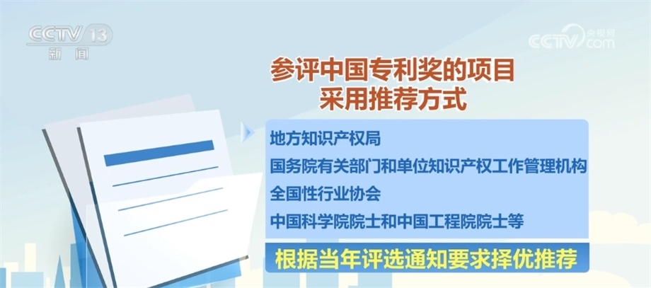 參評中國專利獎(jiǎng)的項(xiàng)目采用推薦方式,由地方知識產(chǎn)權(quán)局、國務(wù)院有關(guān)部門和單位知識產(chǎn)權(quán)工作管理機(jī)構(gòu)、全國性行業(yè)協(xié)會、中國科學(xué)院院士和中國工程院院士等根據(jù)當(dāng)年評選通知要求擇優(yōu)推薦。經(jīng)過評審之后,在國家知識產(chǎn)權(quán)局政府網(wǎng)站公示評選結(jié)果,接受社會監(jiān)督。