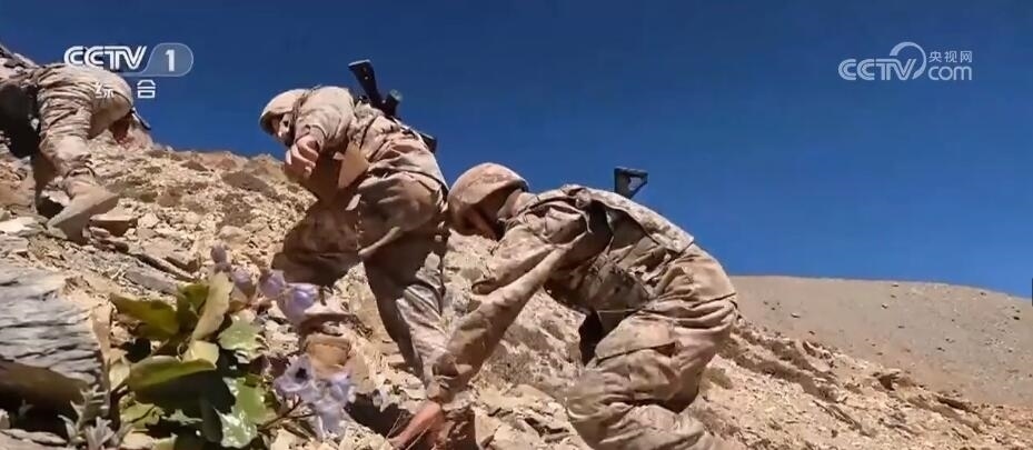 一路走走停停艱難前行。巡邏車行駛至距離點位6公里處停了下來,由于道路塌陷,官兵們只好下車改為徒步巡邏。行走在坡度近70度的陡峭山路上,路面全是碎石,加上海拔不斷攀升,這對巡邏官兵的體能是極大的挑戰(zhàn)。經(jīng)過近4個小時的艱難攀爬,巡邏分隊終于到達了點位。