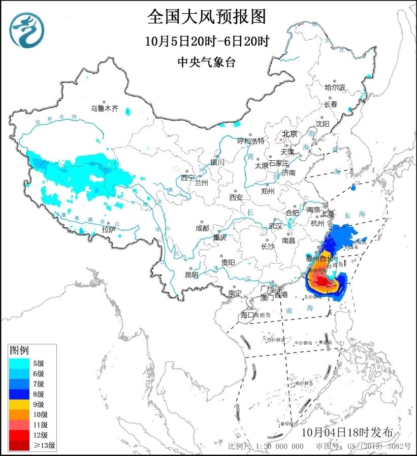 10月5日20時至6日20時,東海西南部海域、臺灣海峽、臺灣以東洋面偏南海域、巴士海峽偏北海域、南海東北部偏北海域?qū)⒂?~8級、陣風9~10級的大風,其中臺灣海峽、南海東北部的部分海域風力可達9~10級、陣風11~12級,臺風“小犬”中心經(jīng)過的附近海域風力可達11~12級、陣風13級;西藏西部、浙江沿海、福建沿海、臺灣島將有5~6級、陣風7級的大風。