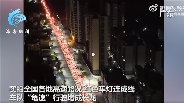 據(jù)??托侣劰俜轿⒉?,10月4日,中秋國慶假期進入第6天,多地陸續(xù)迎來返程高峰。實拍全國各地高速路況,紅色車燈連成線,車隊“龜速”行駛堵成長龍。有網(wǎng)友曬出高速路況畫面表示“特意提前三天回去,沒想到又堵路上了?!?、“帶回的特產(chǎn)都要在路上吃完了”。
