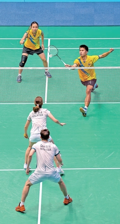 10月4日,杭州亞運(yùn)會(huì)羽毛球混合雙打1/8決賽,馬來西亞體育代表團(tuán)組合對(duì)陣泰國體育代表團(tuán)組合。圖為雙方運(yùn)動(dòng)員在比賽中。本報(bào)記者 伊霄攝