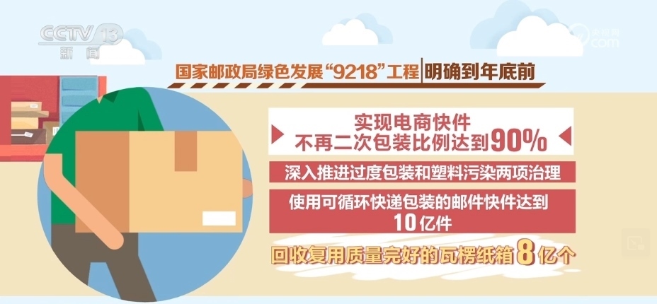 2023年年底前,按照國家郵政局實施的綠色發(fā)展“9218”工程要求,電商快件不再二次包裝比例將達(dá)到90%,深入推進(jìn)過度包裝和塑料污染兩項治理,使用可循環(huán)快遞包裝的郵件快件達(dá)到10億件,回收復(fù)用質(zhì)量完好的瓦楞紙箱8億個。