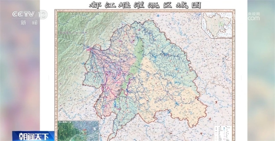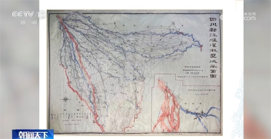 四川省都江堰水利發(fā)展中心副主任 吳鑒:這幅圖是在新中國(guó)成立之前的一張都江堰灌溉的平面圖。從圖上可以顯示,(當(dāng)時(shí))整個(gè)都江堰只灌溉了14個(gè)縣282萬畝的農(nóng)田。這是我們今年新繪制的都江堰灌溉區(qū)域圖。從這個(gè)圖上可以看到,以都江堰作為頂沖點(diǎn),整個(gè)都江堰灌區(qū)變得更大了,扇面進(jìn)一步擴(kuò)大了。