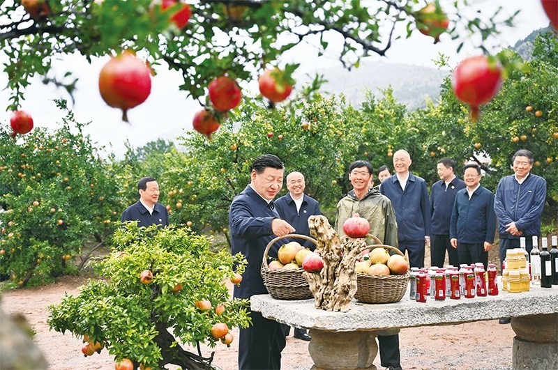 2023年9月24日,中共中央總書記、國家主席、中央軍委主席習近平在浙江考察結束返京途中,來到山東省棗莊市考察。這是習近平在位于嶧城區(qū)的冠世榴園石榴種植園了解石榴產業(yè)發(fā)展情況。 新華社記者 燕雁/攝