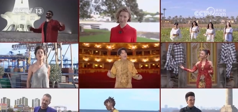 在中國(guó)的春節(jié)聯(lián)歡晚會(huì)上,來自9個(gè)共建“一帶一路”國(guó)家的表演者云端相聚,和著中國(guó)藝術(shù)家的伴奏共唱《一帶繁花一路歌》。