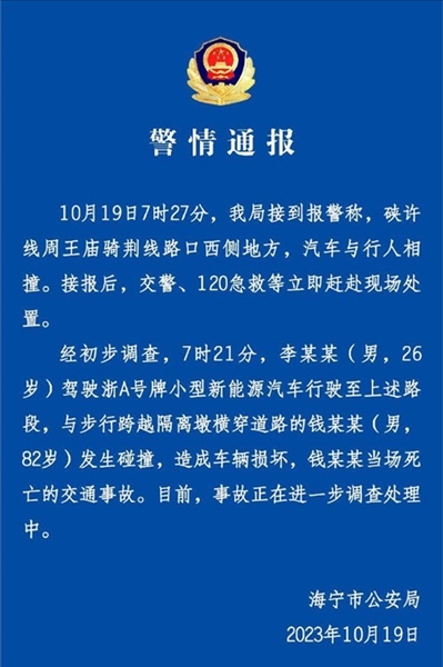 ·浙江海寧82歲老人橫穿馬路被撞身亡,警方通報(bào):事故正在進(jìn)一步調(diào)查處理。