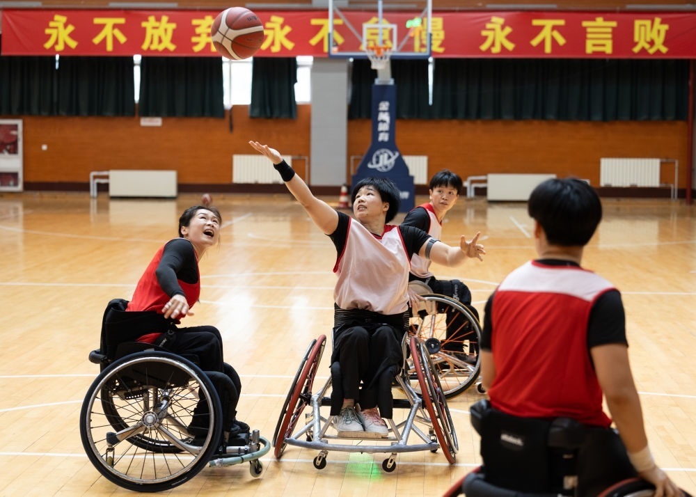 這是2023年8月31日,黃曉連(左二)在中國(guó)殘疾人體育運(yùn)動(dòng)管理中心訓(xùn)練。新華社記者 才揚(yáng) 攝