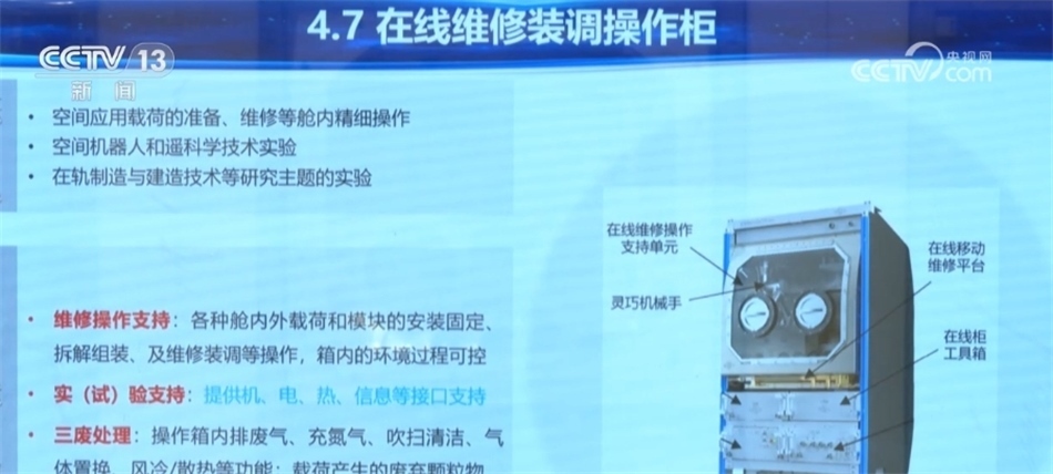 在中國空間站的艙內(nèi)艙外有大量的設(shè)備,這些設(shè)備一旦出現(xiàn)故障該怎么處理呢?我國科研人員創(chuàng)新性地研發(fā)了一套“在線維修裝調(diào)操作柜”,有了它,空間站的實(shí)驗(yàn)設(shè)備和載荷一旦出現(xiàn)故障,就可以在軌進(jìn)行維修。下面記者就帶我們一起來了解這個(gè)中國空間站的設(shè)備維修“利器”。
