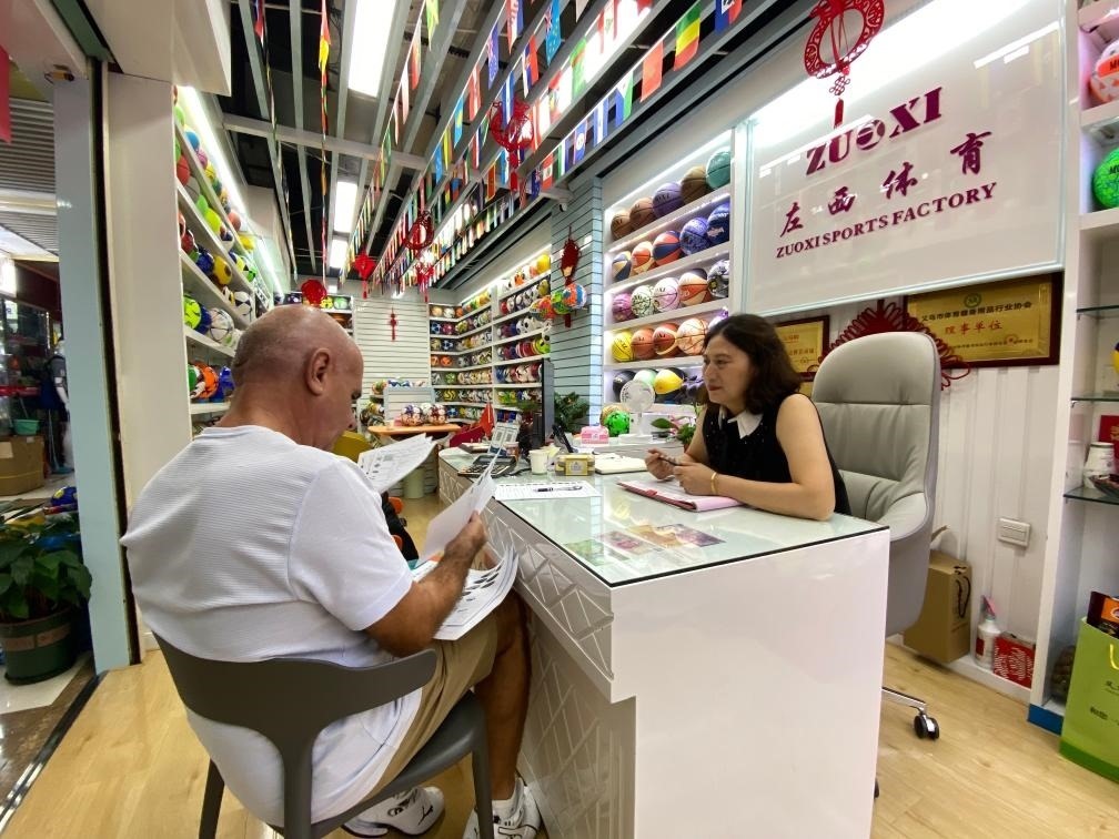 義烏國(guó)際商貿(mào)城內(nèi),經(jīng)營(yíng)戶正在與國(guó)外客戶洽談。新華社記者魏一駿 攝