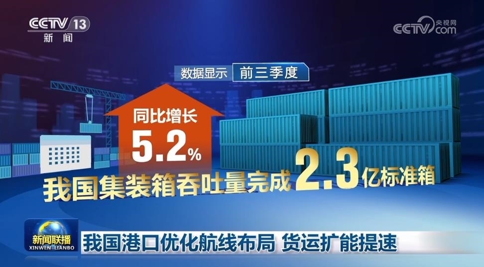 數(shù)據(jù)顯示,前三季度我國集裝箱吞吐量完成2.3億標準箱,同比增長5.2%。其中第三季度增長5.9%,增速較上半年加快1個百分點。