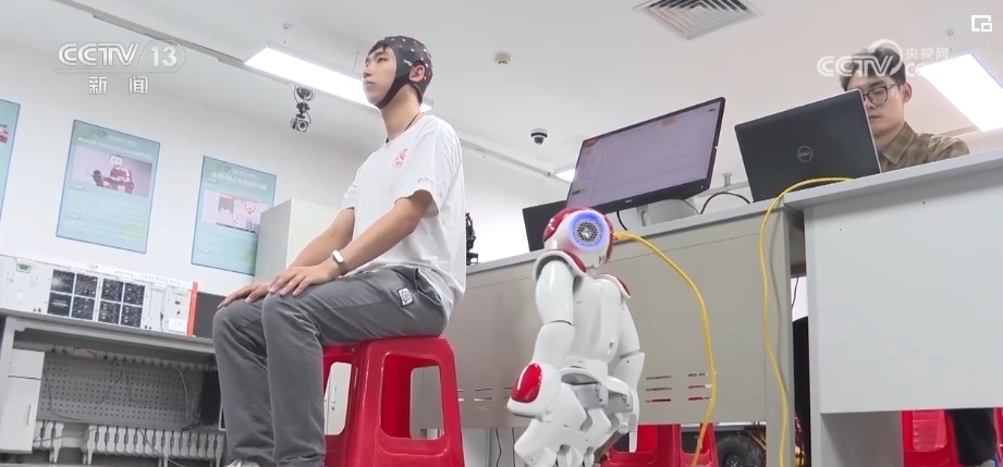 記者來到這間研發(fā)人形機器人的實驗室時,科研團(tuán)隊正在測試機器人的同步能力。眼前的機器人不僅可以通過攝像頭,捕捉人們的動作后進(jìn)行同步模仿,還可以通過腦機接口、肌電交互等方式,捕捉人們的腦電信息和運動意圖,直接同步控制機器人的行為。