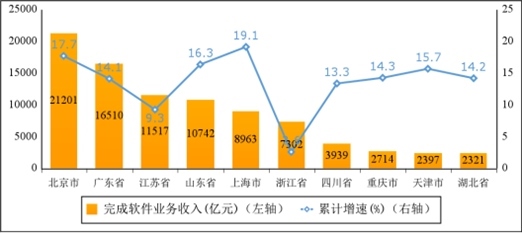 主要軟件大省收入占比持續(xù)提升。1—10月份,軟件業(yè)務(wù)收入居前5名的省份中,北京市、廣東省、江蘇省、山東省、上海市軟件收入分別為21201億元、16510億元、11517億元、10742億元和8963億元,分別增長17.7%、14.1%、9.3%、16.3%和19.1%,五?。ㄊ校┖嫌嬡浖I(yè)務(wù)收入68933億元,占全國比重為70.2%,占比較去年同期提高1個百分點。