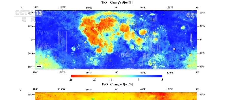 吉林大學(xué)地球科學(xué)學(xué)院教授 楊晨:之前我們主要采用的月球表面元素成分圖,主要是基于美國(guó)和蘇聯(lián)的樣品數(shù)據(jù),主要反映的是月球30億年前的演變。我國(guó)采樣的嫦娥五號(hào)數(shù)據(jù),可以反映年輕的、20億年以來(lái)的月球歷史。我們基于嫦娥五號(hào)樣品數(shù)據(jù),獲得了月球表面六種主要元素在月球上的分布情況。其中,紅色部分代表元素含量相對(duì)較高,比如鈦和鐵。我們發(fā)現(xiàn)在月海附近(區(qū)域),它們的含量相對(duì)豐富,這兩種元素對(duì)于判定年輕月海玄武巖具有重要意義。