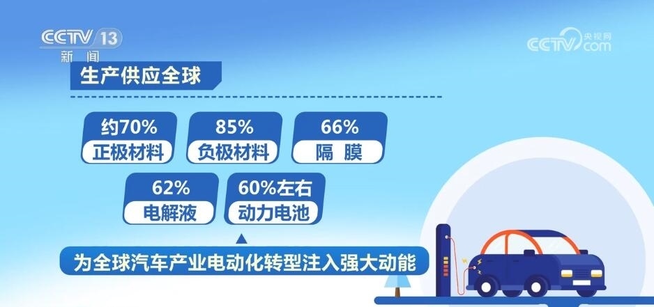 工業(yè)和信息化部表示,我國已建立了結構完整、有機協(xié)同的新能源汽車產業(yè)鏈、供應鏈體系,涵蓋基礎材料、零部件、整車、制造裝備等全鏈條,生產供應了全球約70%的正極材料、85%的負極材料、66%的隔膜、62%的電解液以及60%左右的動力電池,為全球汽車產業(yè)電動化轉型注入了強大動能。