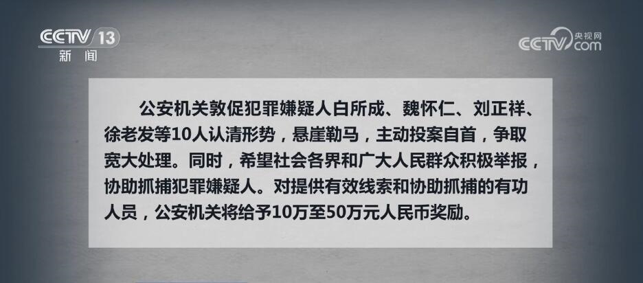 公安機(jī)關(guān)敦促犯罪嫌疑人白所成、魏懷仁、劉正祥、徐老發(fā)等10人認(rèn)清形勢(shì),懸崖勒馬,主動(dòng)投案自首,爭(zhēng)取寬大處理。同時(shí),希望社會(huì)各界和廣大人民群眾積極舉報(bào),協(xié)助抓捕犯罪嫌疑人。對(duì)提供有效線索和協(xié)助抓捕的有功人員,公安機(jī)關(guān)將給予10萬(wàn)至50萬(wàn)元人民幣獎(jiǎng)勵(lì)。