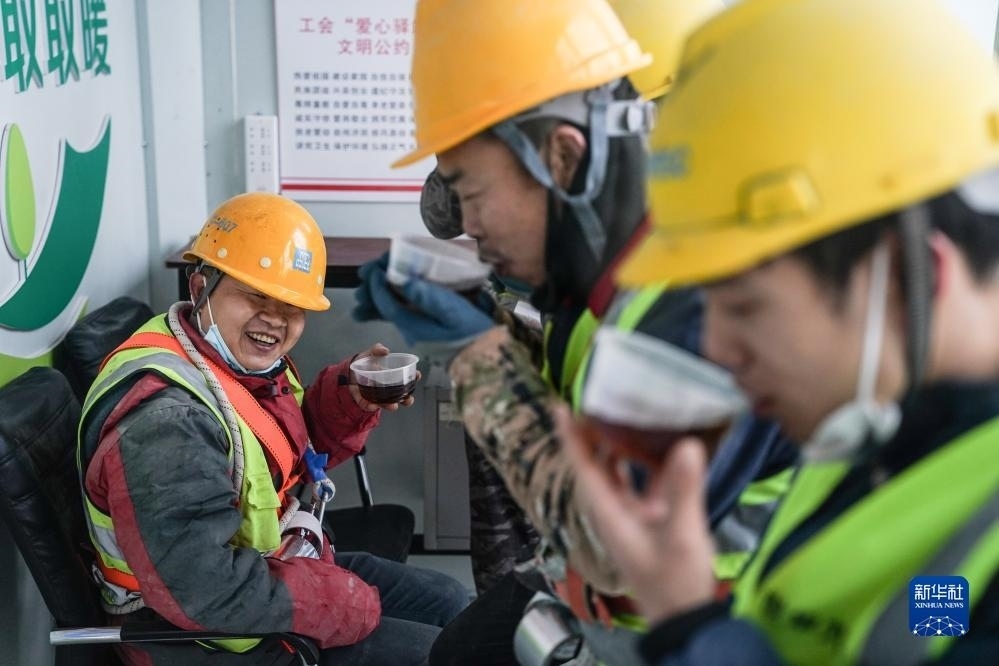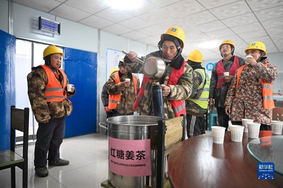 12月12日,在中建二局北方公司天津泰康項目工地,工人在飲用為他們準(zhǔn)備的紅糖姜茶驅(qū)寒。