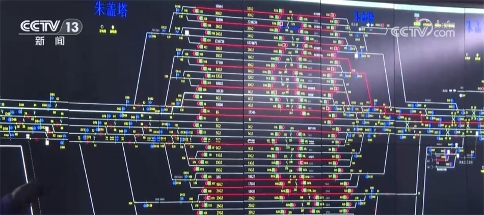 總臺央視記者 張叢婧:我現(xiàn)在是來到了車站的行車指揮室,可以看到這塊大屏幕上實時顯示著車站的列車狀態(tài),中間這些紅色的線就代表著此時軌道上正在有列車作業(yè)或者等待作業(yè),左邊這些紅色線就意味著現(xiàn)在有列車正在進站。