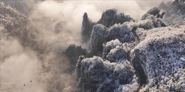 12月19日,湖南張家界國家森林公園天子山雪后初霽,山巒間銀裝素裹,云霧繚繞,美如畫卷。