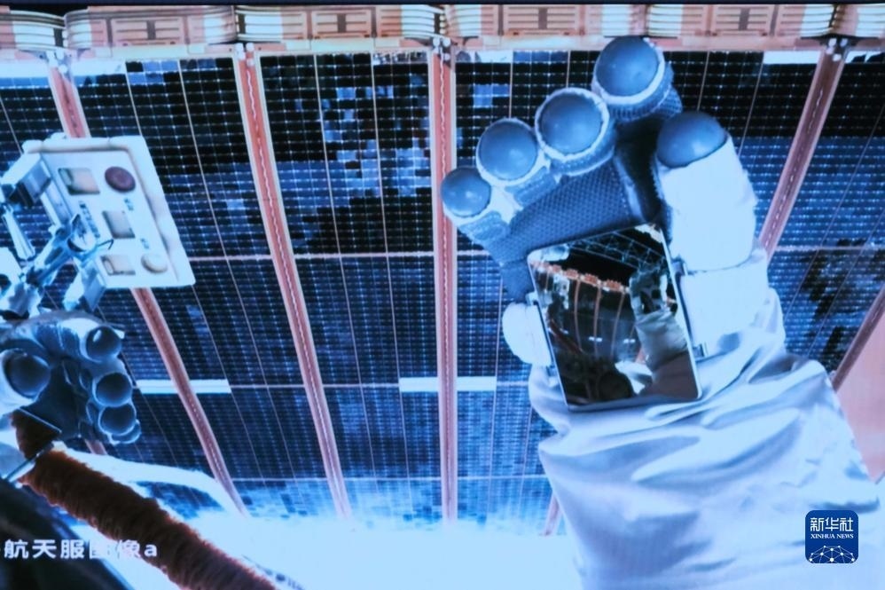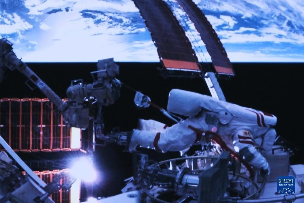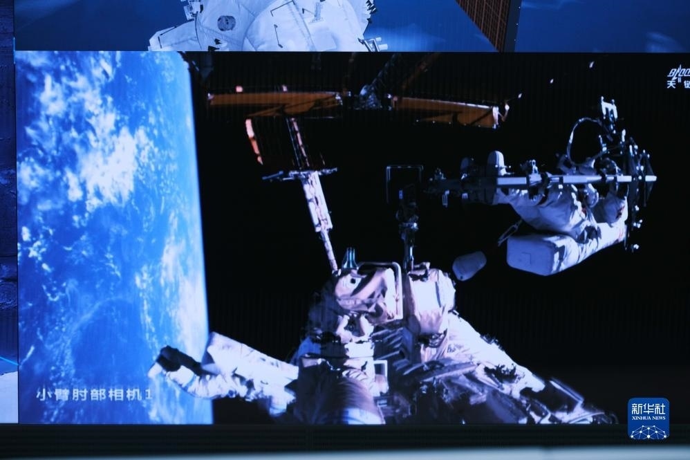 12月21日在北京航天飛行控制中心拍攝的神舟十七號航天員湯洪波開展艙外操作的畫面。新華社記者 李杰 攝