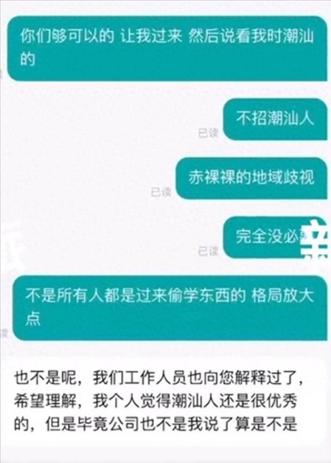 ·廣東深圳一男子求職因籍貫是潮汕直接被拒,工作人員稱“老板說潮汕人就會偷偷摸摸學東西”。