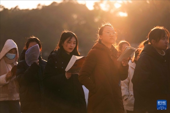 12月23日,在湖南省長沙市,考生在湖南農(nóng)業(yè)大學(xué)考點(diǎn)排隊(duì)時(shí)抓緊復(fù)習(xí)。