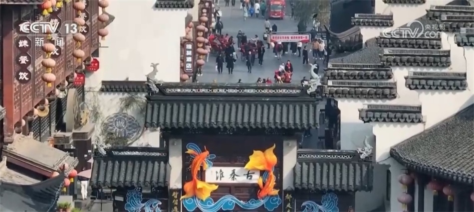 ??????新年將至,南京秦淮河畔的各式花燈陸續(xù)落成,與古建筑相互映襯。碧水繞城,畫(huà)舫穿行,裝扮后的古城如畫(huà)如詩(shī)。在“古秦淮”的牌坊上,魚(yú)躍龍門(mén)的造型立體生動(dòng)。人們穿過(guò)牌坊,采買年貨,拍照留念。在夫子廟南側(cè)的門(mén)東歷史文化街區(qū),一條大龍?jiān)煨偷幕粢莱菈ΧⅰJ艚M活靈活現(xiàn),讓古樸的街巷增添了迎新的色彩。
