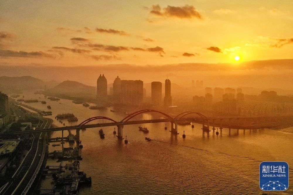 2024年第一縷晨光下的浙江舟山沈家門漁港(1月1日攝,無人機照片)。新華社發(fā)(邢守秒 攝)