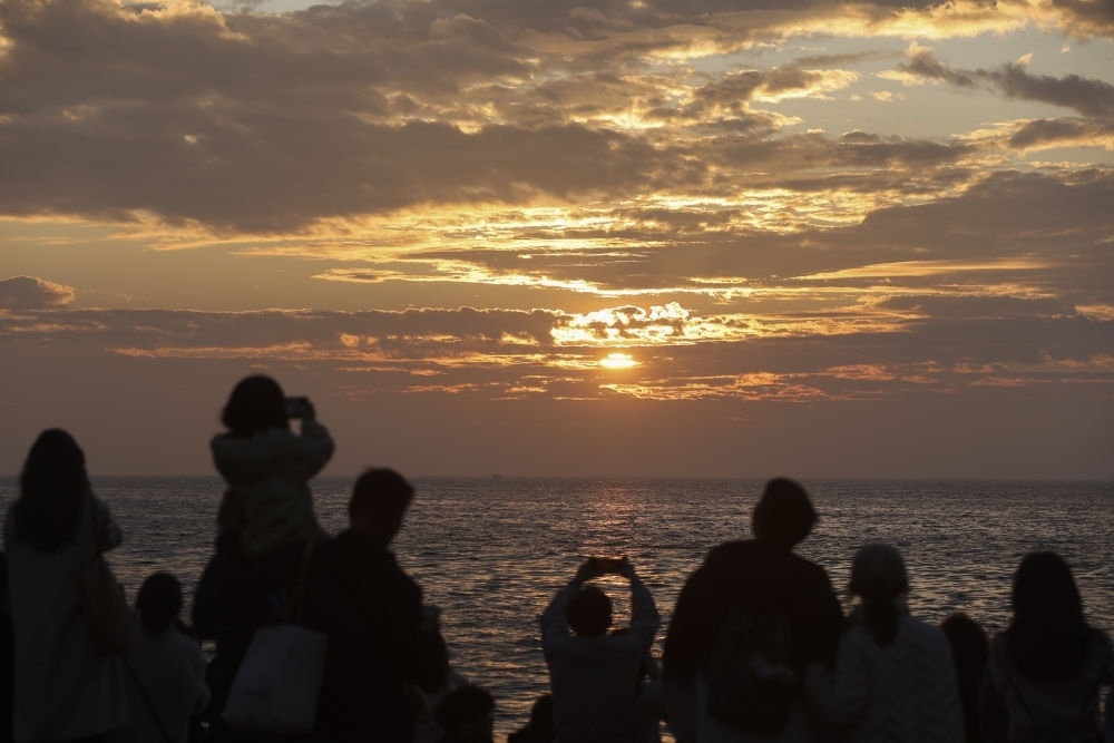 1月1日,人們在山東省煙臺市萊山區(qū)海濱觀賞新年日出。新華社發(fā)(唐克 攝)