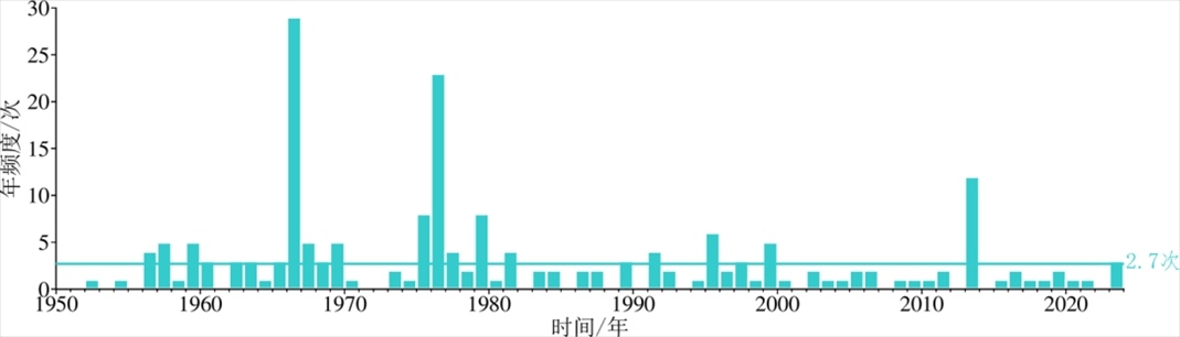 2023年以來大陸東部及附近海域發(fā)生5級以上地震3次,分別為6月24日北部灣5.0級、8月6日山東平原5.5級和10月23日廣東南澳縣海域5.0級地震,地震活動水平較2022年(0次)顯著增強(qiáng),為 2014 年以來活動頻次最高年份。