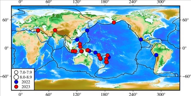 2023年95%的全球7級以上地震發(fā)生在歐亞地震帶和澳大利亞板塊東北邊界。其中歐亞地震帶發(fā)生7級以上地震7次,澳大利亞板塊東北邊界發(fā)生7級以上地震11次。