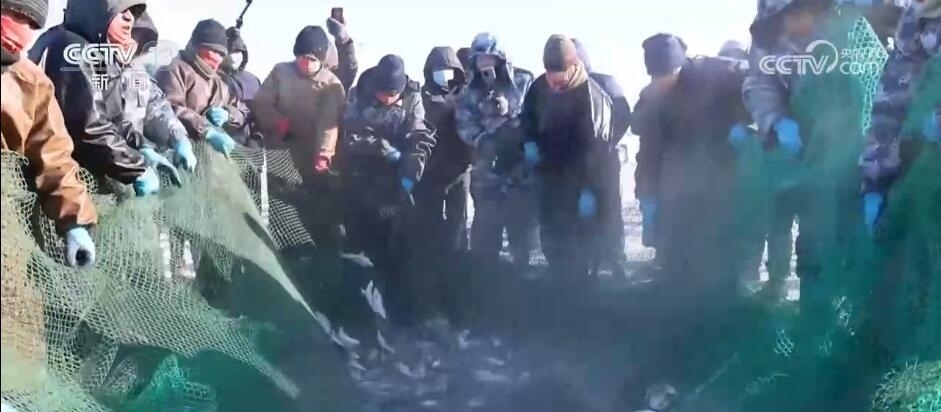 在克什克騰旗達(dá)里湖現(xiàn)場(chǎng),人工鑿冰、冰下走網(wǎng),冬捕隊(duì)員在作業(yè)時(shí)選用5公分網(wǎng)眼,這樣捕魚(yú)時(shí)就能漏掉小魚(yú)。馬拉絞盤(pán)將大網(wǎng)拖拽出網(wǎng)口,滿(mǎn)載魚(yú)兒的漁網(wǎng)慢慢地從湖水中出來(lái),游客們感受豐收的喜悅。