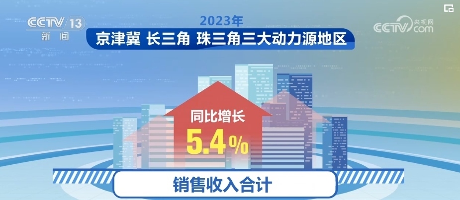 2023年,京津冀、長三角、珠三角三大動力源地區(qū)經(jīng)濟(jì)總體呈現(xiàn)較快發(fā)展態(tài)勢,銷售收入合計(jì)同比增長5.4%,占全國比重提高至54.1%,較2022年提高0.3個(gè)百分點(diǎn),帶動作用持續(xù)增強(qiáng)。