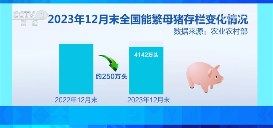 針對生豬產能偏高、養(yǎng)殖持續(xù)虧損的問題,農業(yè)農村部指導各地加強生豬產能調控,引導養(yǎng)殖場戶適應性調減產能,順時順勢出欄肥豬,加快供需回歸均衡。2023年12月末,全國能繁母豬存欄量4142萬頭,比2022年12月末的階段性高點減少約250萬頭。
