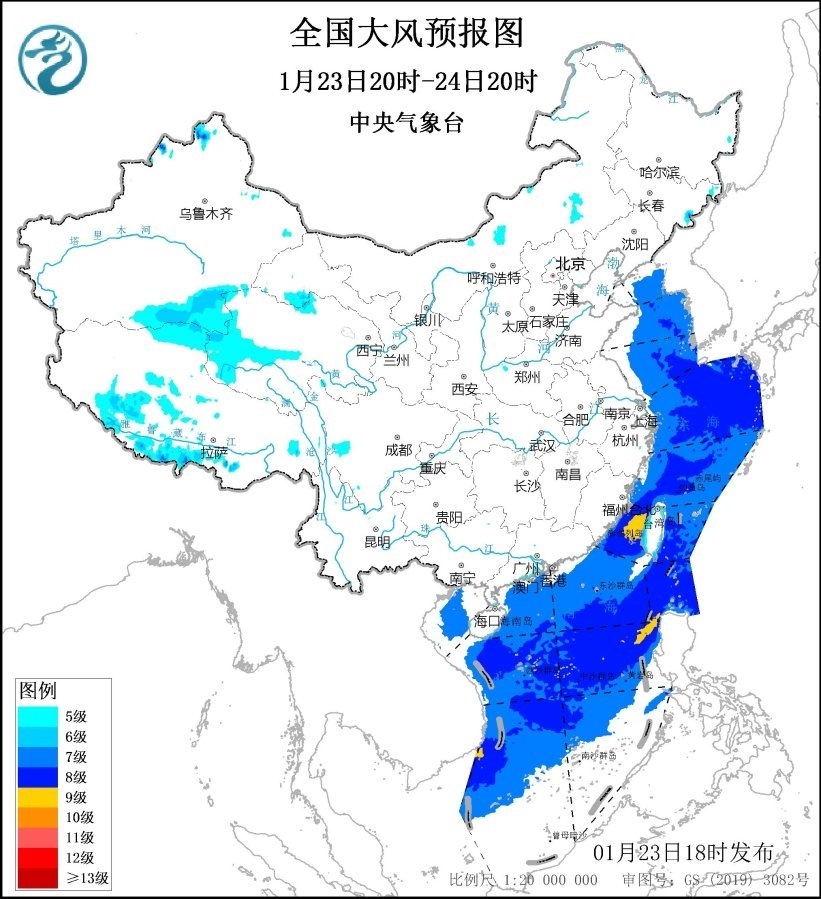中央氣象臺1月23日18時繼續(xù)發(fā)布大風藍色預警:預計,1月23日20時至24日20時,西藏南部、青海西部、福建沿海、廣東沿海等地的部分地區(qū)有5~6級、陣風7~8級的大風;黃海大部海域、東海大部海域、臺灣海峽、臺灣以東洋面、巴士海峽、北部灣、南海大部海域?qū)⒂?~8級、陣風9~10級的大風,其中臺灣海峽、巴士海峽、南海中東和西南部的部分海域風力可達9級、陣風10~11級。