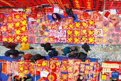春節(jié)臨近,各地張燈結(jié)彩。人們逛花市、賞花燈、置辦年貨,年味漸濃。這是無人機(jī)拍攝的1月22日山東省青島市李村大集,人們在選購春節(jié)飾品。