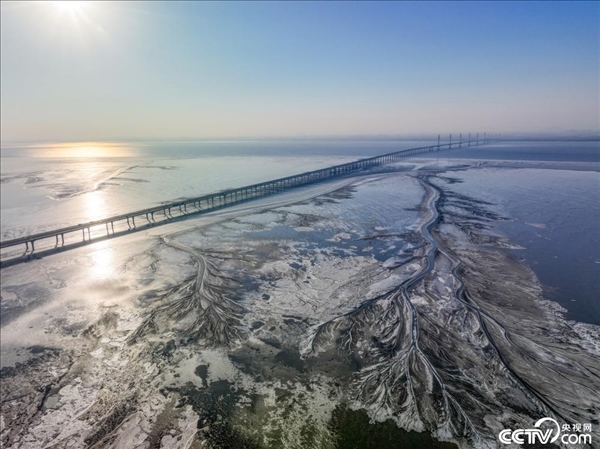 1月24日,浙江省嘉興市寒潮來襲,錢塘江結(jié)冰,灘涂上出現(xiàn)巨大的“冰雪潮汐樹”。