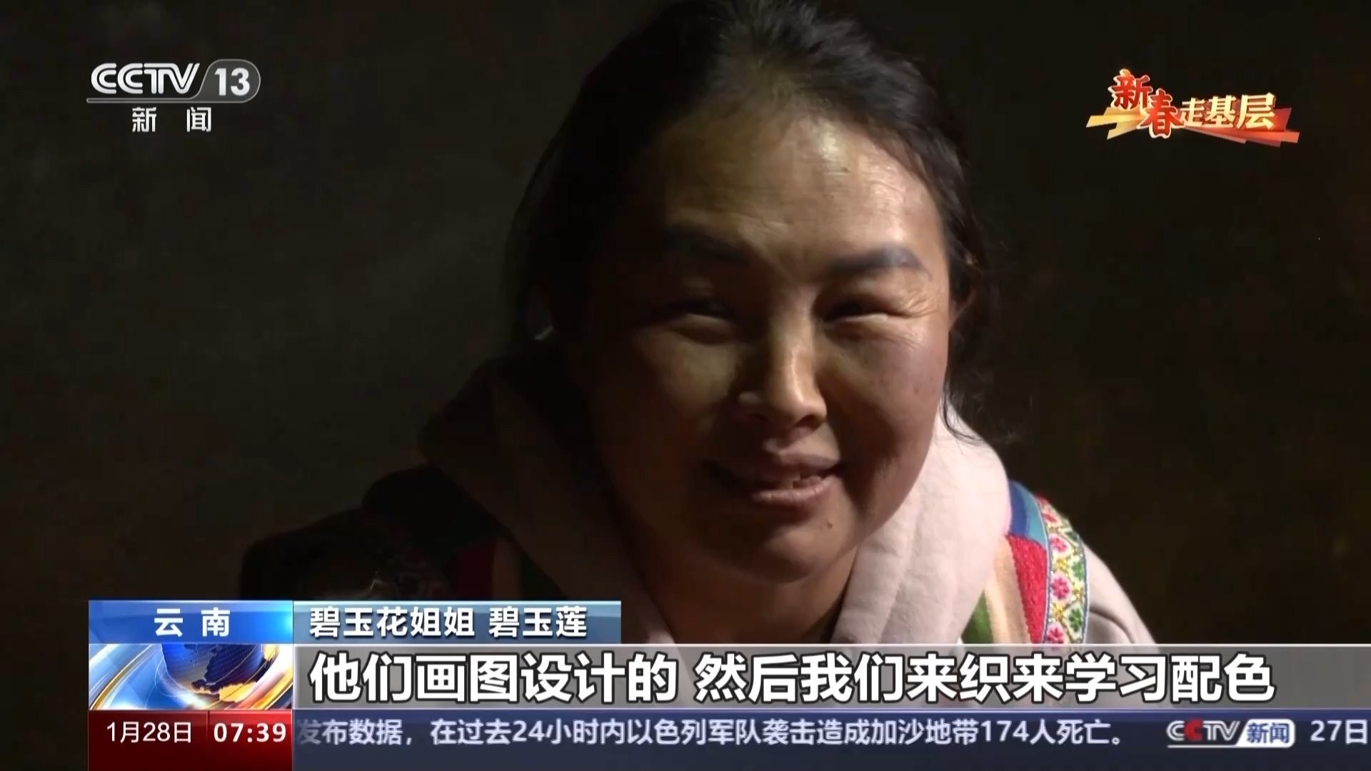 碧玉花姐姐 碧玉蓮:他們畫圖設(shè)計(jì),然后我們來織,來學(xué)習(xí)配色。就像這竹子一樣的綠色,江水一樣的藍(lán)色和草果一樣的紅色。