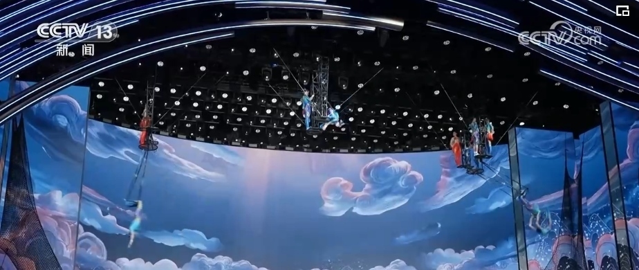 40多年來(lái),春晚劇組首次在1號(hào)廳高空安裝飛人裝置,道具和技巧以及創(chuàng)意的融合,完美演繹了傳說(shuō)中的魚(yú)躍龍門(mén)。