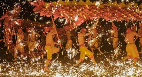 銅梁龍舞是首批國(guó)家級(jí)非物質(zhì)文化遺產(chǎn),被譽(yù)為“中華第一龍”。1500℃的鐵水瞬間在空中炸開(kāi),綻放成美麗的煙花雨。