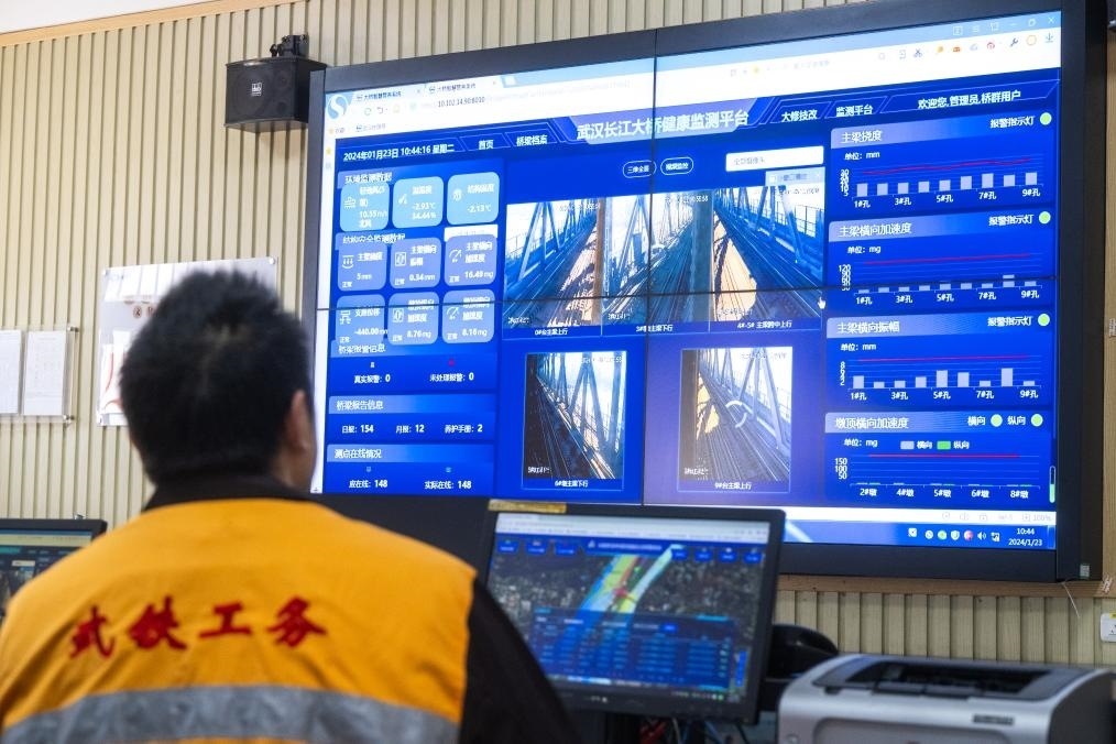 進入高鐵時代,隨著技術(shù)的發(fā)展與進步,大橋養(yǎng)修標準提升,養(yǎng)護水平不斷提高。在武漢長江大橋橋梁車間辦公樓一樓的主控室,大屏上顯示著大橋數(shù)十處關(guān)鍵處所監(jiān)控畫面,大橋上橋梁防撞監(jiān)控系統(tǒng)和橋梁健康監(jiān)測系統(tǒng)的各項數(shù)據(jù)實時更新。