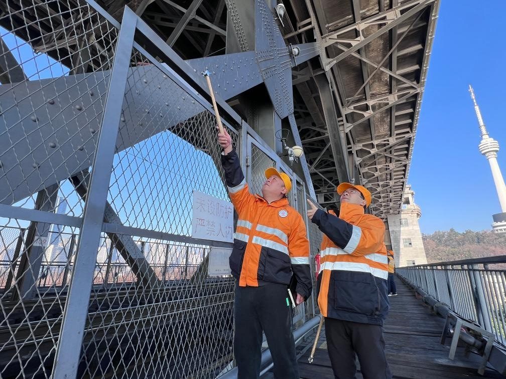 1月23日,武漢長江大橋橋梁車間員工對武漢長江大橋進行養(yǎng)護作業(yè)。新華社記者肖藝九 攝