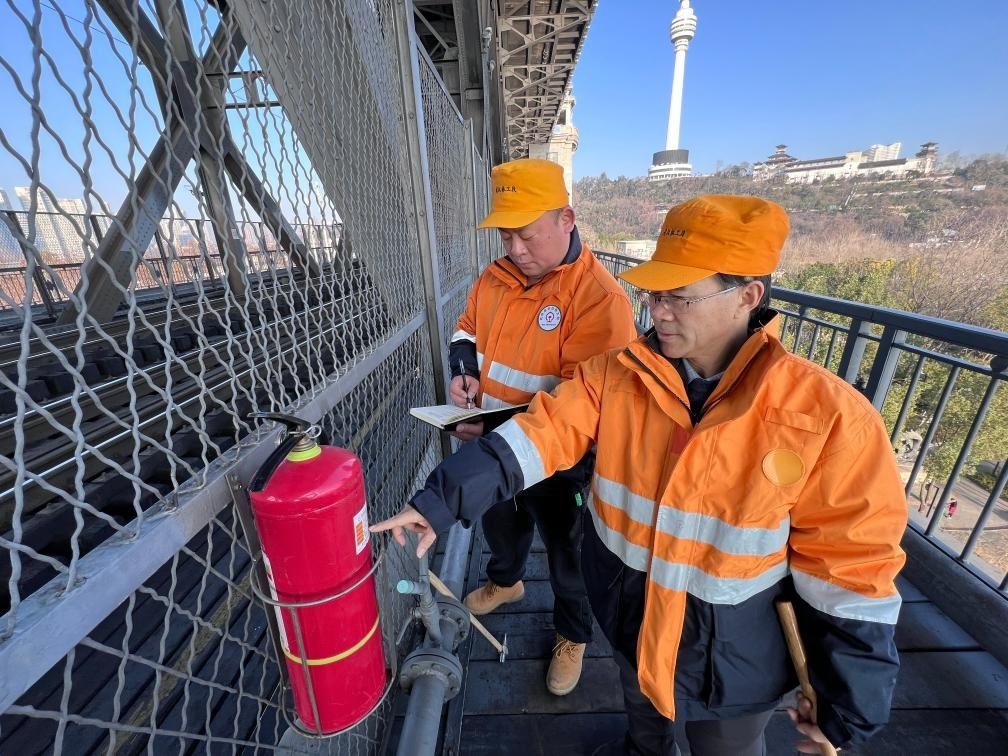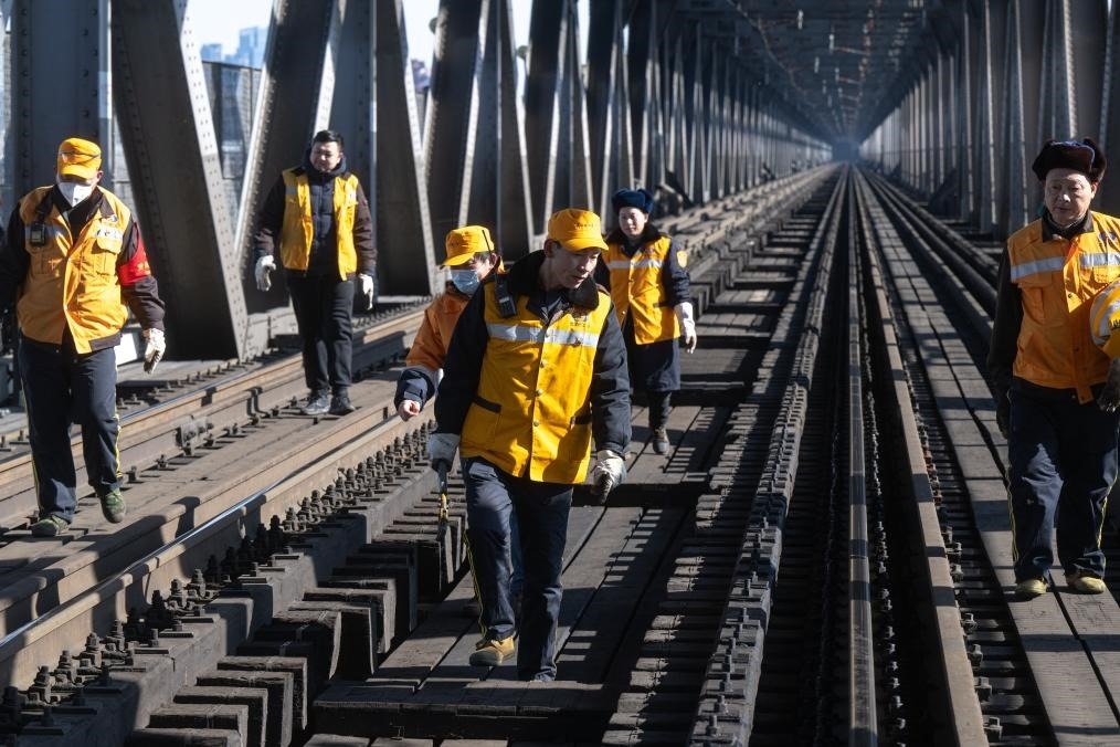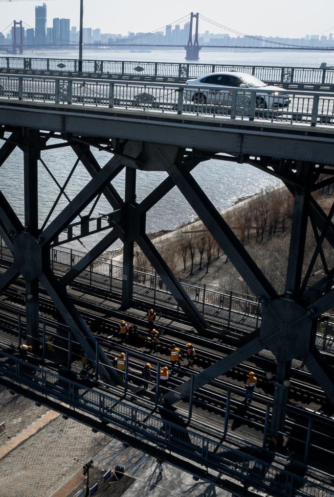 農(nóng)歷大年初三,湖北武漢陽光明媚。“萬里長江第一橋”——武漢長江大橋宛若一條巨龍飛架于江水之上,氣勢恢宏。身穿工作服的陳卿明和同事,低頭、彎腰,循著大橋鐵道仔細地檢視鋼梁、枕木。