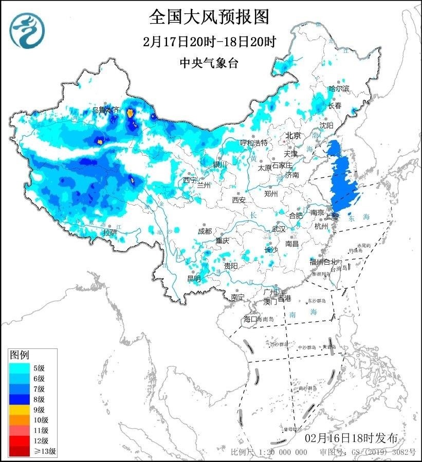 2月17日20時至18日20時,新疆北疆東部和南疆盆地、內(nèi)蒙古西部、青海西南部、西藏西部、甘肅西部等地將有5~7級、陣風8~9級的大風,新疆山口地區(qū)風力可達10級,陣風12~13級;黃海大部海域、東海北部海域?qū)⒂?級、陣風8~9級的大風。