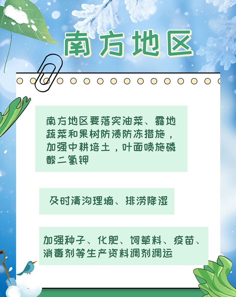 南方地區(qū)要落實(shí)油菜、露地蔬菜和果樹防漬防凍措施,加強(qiáng)中耕培土,葉面噴施磷酸二氫鉀;及時(shí)清溝理墑、排澇降濕。加強(qiáng)種子、化肥、飼草料、疫苗、消毒劑等生產(chǎn)資料調(diào)劑調(diào)運(yùn)。